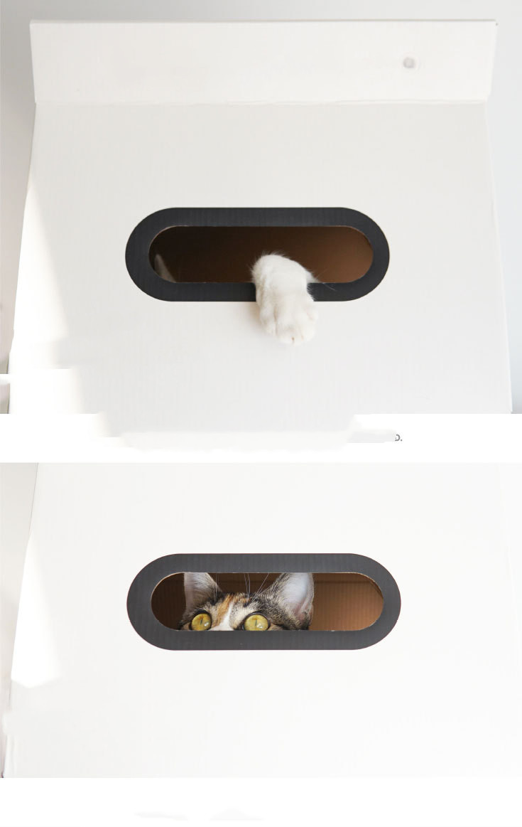 Color: white house, book stand box cat scratch board, lying flat cat scratch board box