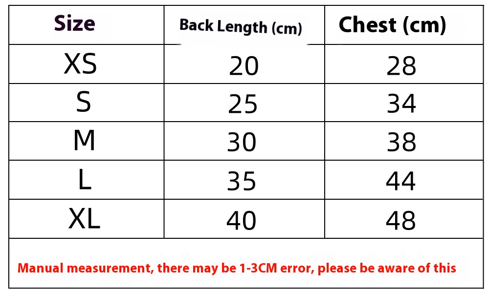Size: XS chest circumference 28cm, back length 20cm, inner 1.50kg, S chest circumference 34cm, back length 25cm, 2.00 kg-3.00 kg, M chest circumference 38cm, back length 30cm, 3.50 kg-4.50 kg, L chest circumference 44cm, back length 35cm, 5.00 kg-6.00 kg, XL chest circumference 48cm, back length 40cm, 7.00 kg-9.00 kg