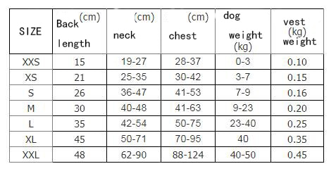 | Size | Back Length(cm) | Neck(cm) | Chest(cm) | dog weight(cm) |