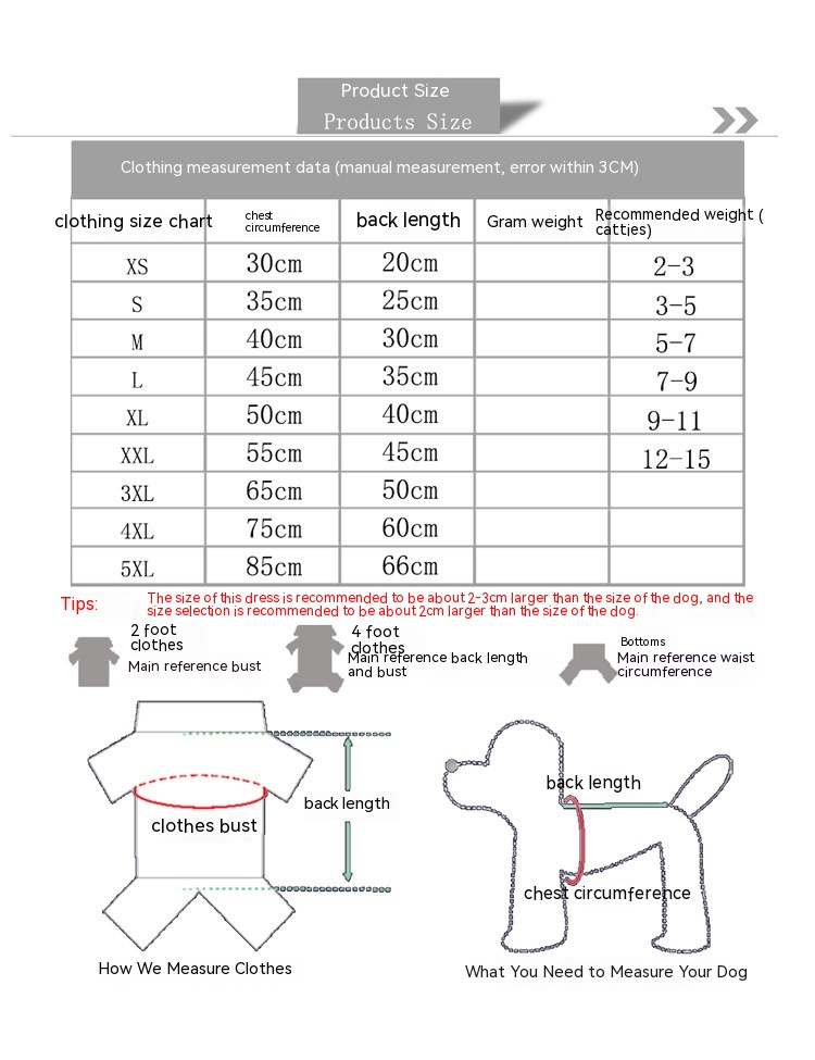 Size: XS (about 1.00 kilograms-1.50 kilograms of pets),S (about 1.50 kilograms-2.50 kilograms of pets),M (about 2.50 kilograms-3.50 kilograms of pets)),L (about 3.50kg-4.50kg pet),XL (about 4.50kg-5.50kg pet),2XL (about 6.00kg-8.00kg pet),3XL (about 8.00kg-15.00kg pet),4XL (about 15.00kg-25.00kg pet),5XL (about 25.00kg-40.00kg pet))