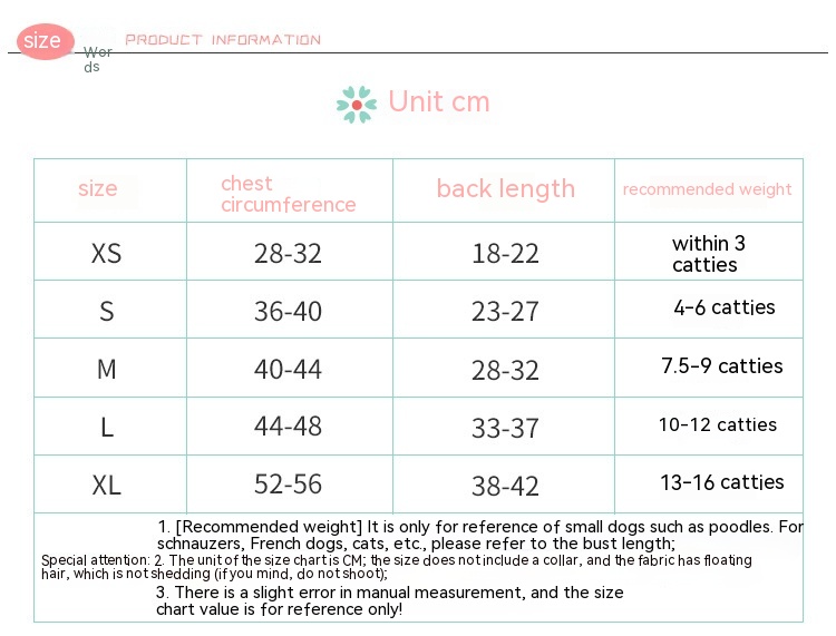 Size: XS-chest circumference 30 length 20cm about 1.00 kg-1.50 kg, S-chest circumference 35 length 25cm about 2.00 kg-3.00 kg, M-chest circumference 40 length 30cm about 3.50 kg-4.00 kg, L-chest circumference 48 length 35cm about 5.00 kg-6.00 kg, XL-chest circumference 54 length 40cm about 7.00 kg-9.00 kg