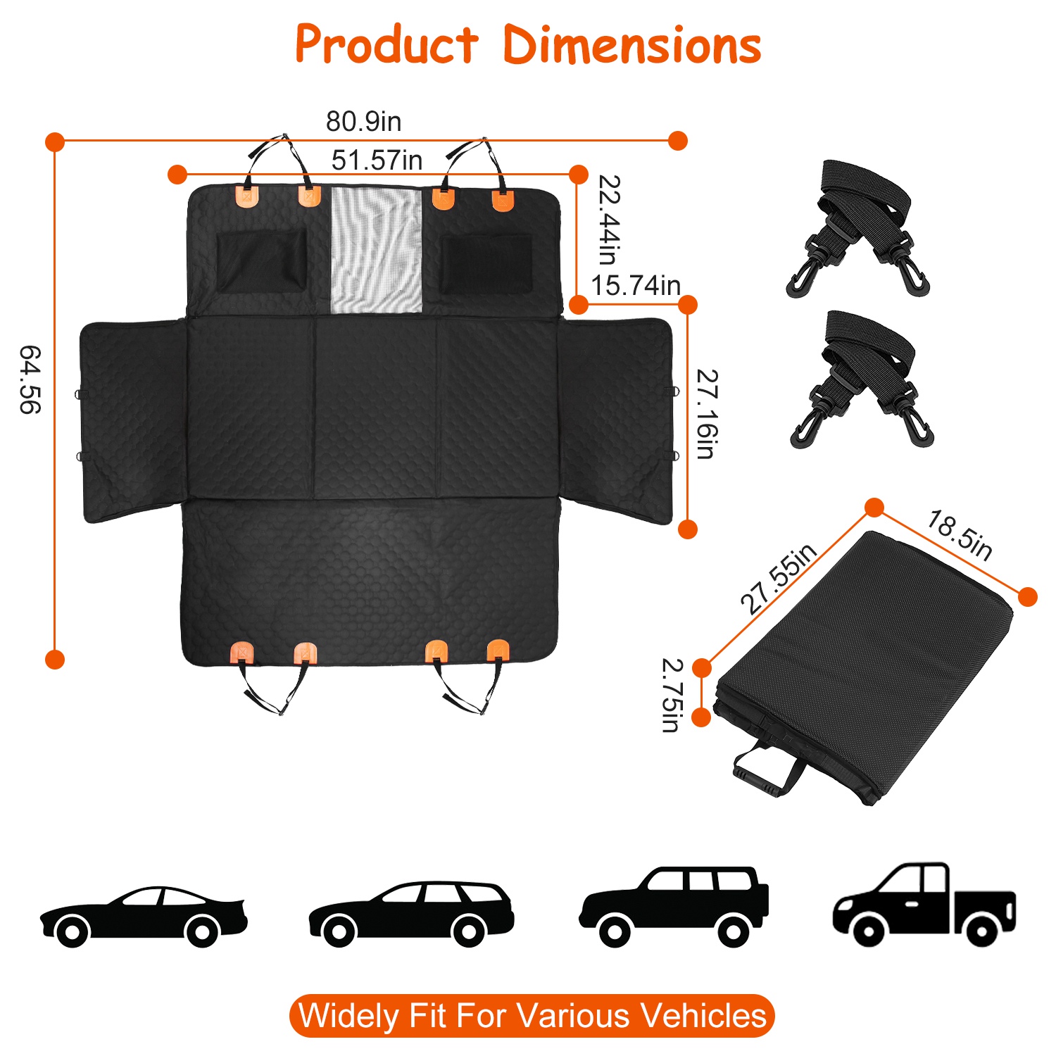 • *Fit For Most Cars*:The unfold size of this backseat protector is 80.9x64.56in(L x W),perfectly fit for various vehicle types like all cars,SUVs,trucks etc.. Suitable for your beloved dogs,cats etc.. It provides a snug and secure fit,ensuring that your pet stays safe and comfortable throughout the ride. Before purchasing,please measure your rear seat dimensions to see if they match and the car seat should have a headrest bar.